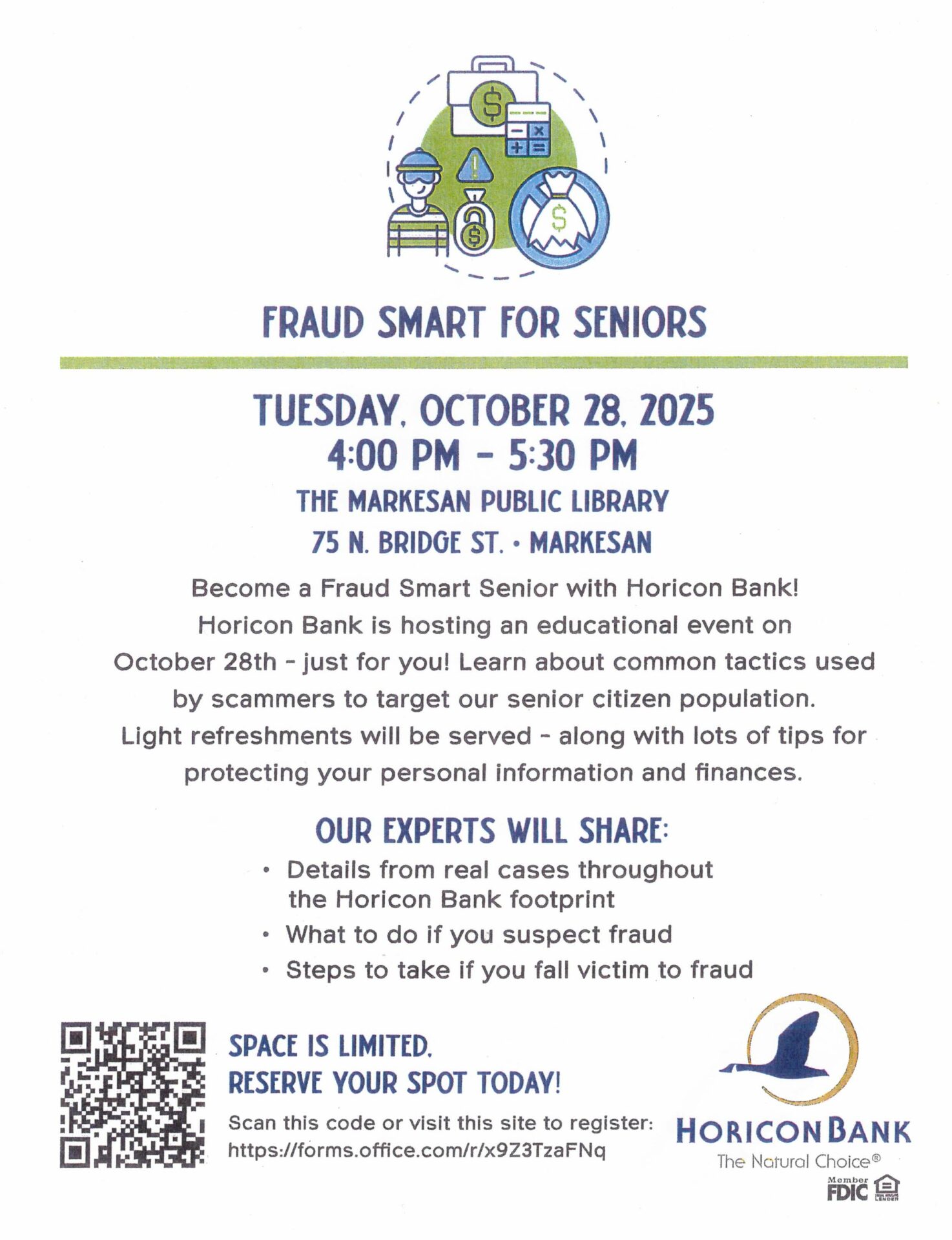 On Tuesday, October 28 from 4:00-5:30 pm, Horicon Bank representatives will host an educational event just for you! Learn about common tactics used by scammers to target our senior citizen population. Light refreshments will be served - along with lots of tips for protection your personal information and finances.
