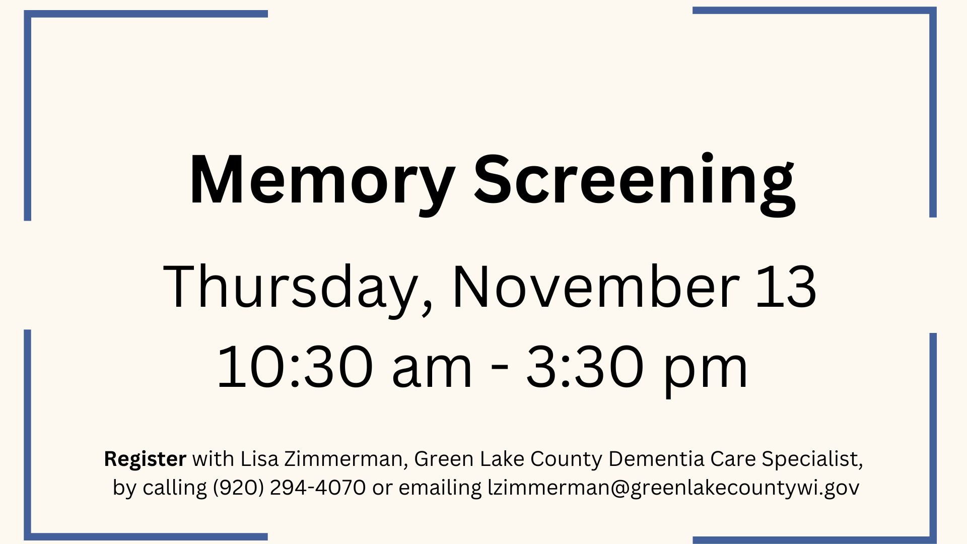 Lisa Zimmerman, Green Lake County Dementia Care Specialist, will be conducting a memory screening clinic on Thursday, November 13 from 10:30 am – 3:30 pm. These screenings are simple tools to evaluate memory and other thinking skills. They will be conducted privately, and the results are confidential.
