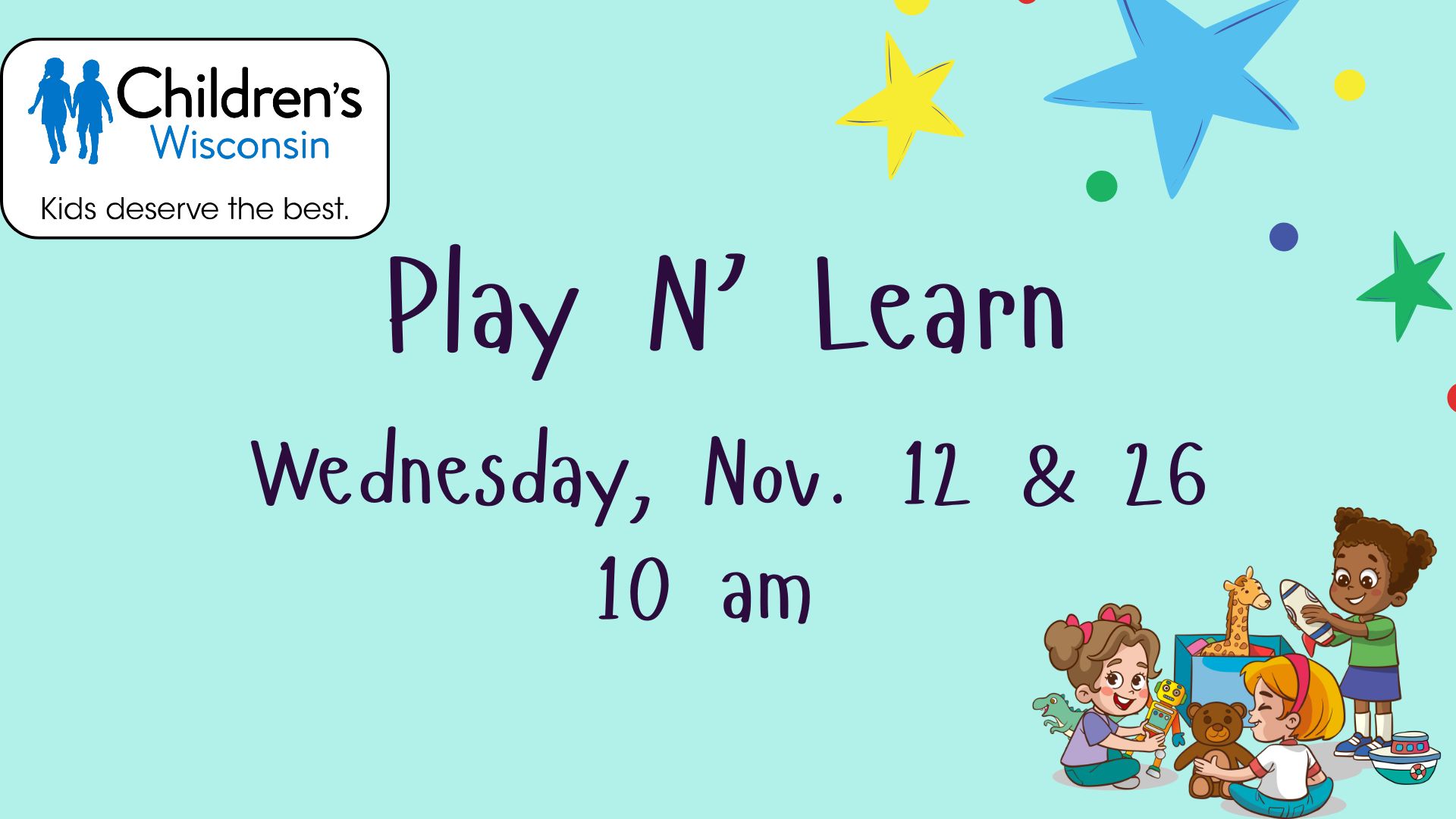 On Wednesday, November 12 at 10:00 am, children are invited to Play N' Learn! Come to the library for a fun session of games and activities that promote learning through play, provided by Children's Wisconsin!