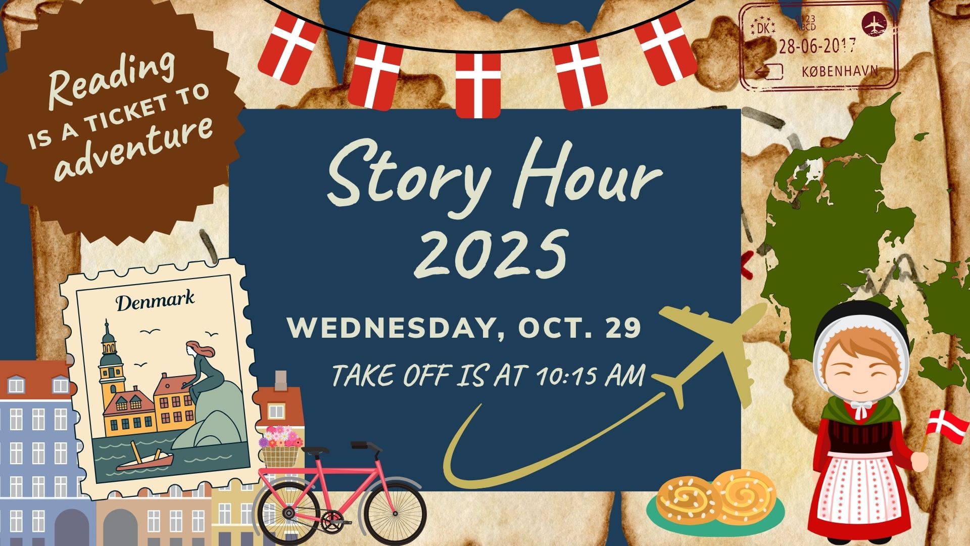 We'll be travelling the world during Story Hour in 2025! On the first and third Wednesdays of each month at 10:15 am, children can explore new countries through stories with Miss Kristina. They'll also receive a passport that will be stamped each Story Hour! On Wednesday, October 29 at 10:15 am, we're going to Denmark!