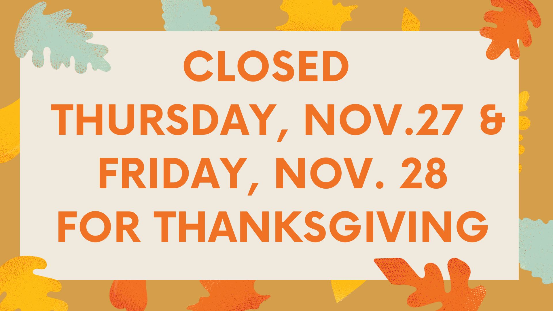 The library will be closed Thursday, November 27 and Friday, November 28 for the Thanksgiving holiday.
