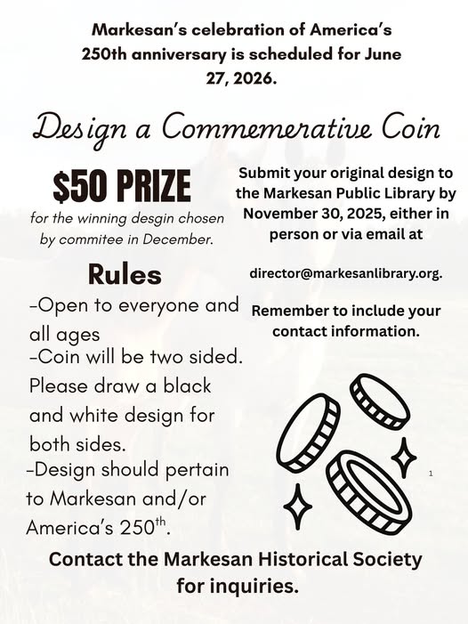 We are a drop-off location for the Markesan Historical Society’s “Design a Commemorative Coin” Contest! This is your chance to design a special coin celebrating America’s 250th anniversary in 2026, AND win a $50 cash prize!