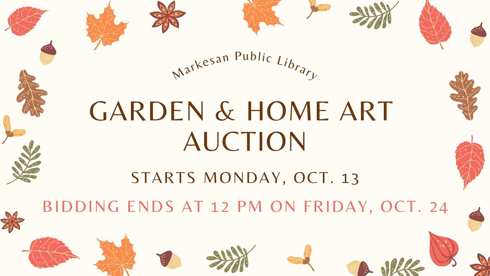 Our annual Garden & Home Art Auction has begun! Starting Monday, October 13, this silent auction helps raise funds for hosting library programs and building our collection. Find artwork, handmade crafts, and fun gift baskets generously donated by local businesses and community members.