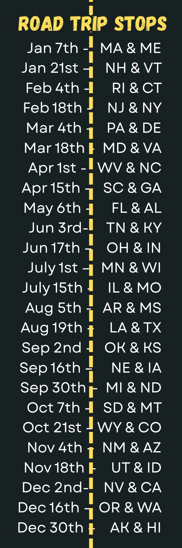 Week 1: Maine & Massachusetts – List will be posted after Story Hour
