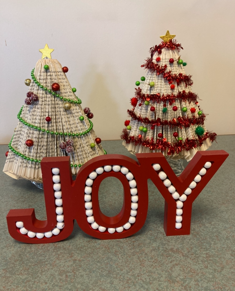 We have special Take & Make Craft Kits available now at the checkout desk! These free kits have the supplies to make a folded book Christmas tree, including the star, tinsel, and other decorations! All you’ll need at home is a glue gun.
